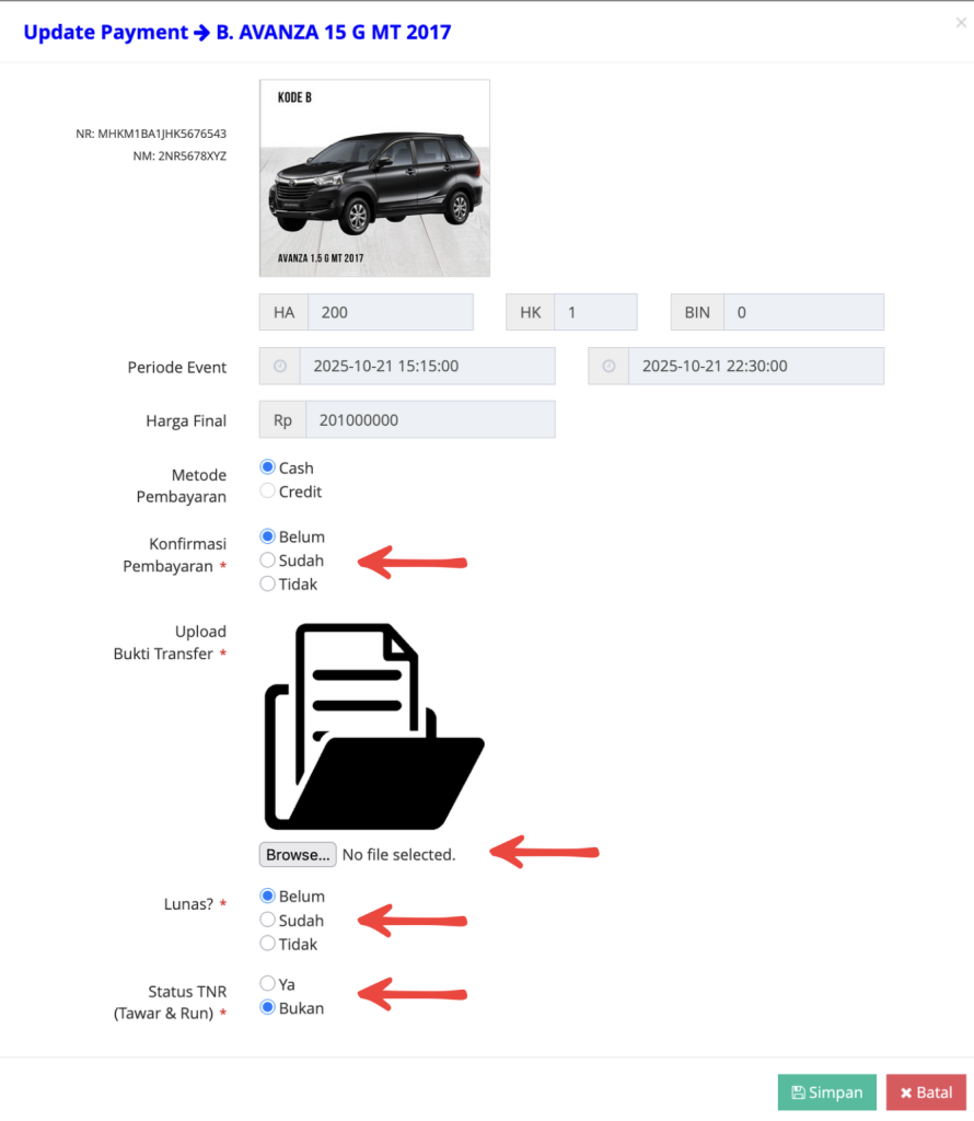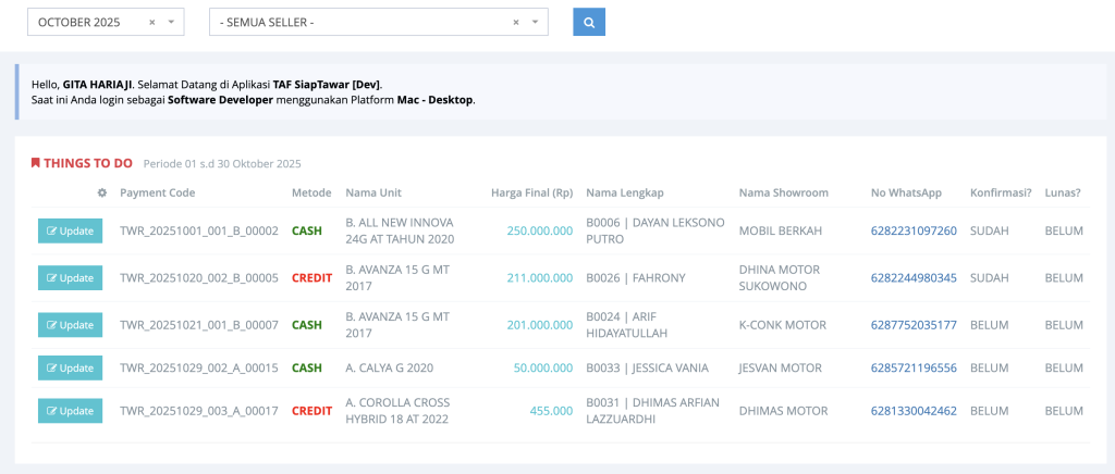- Customer dengan metode pembayaran CASH, Admin TAF upload bukti pembayaran unit oleh Customer